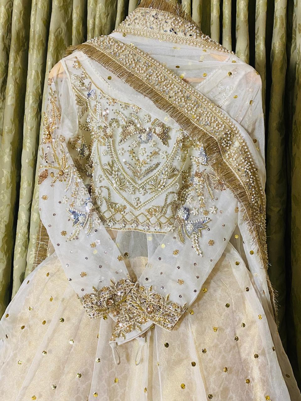 Intricate hand embroidery with handwork adorned with dabka, pearls and tilla work. Fully customizable outfit.